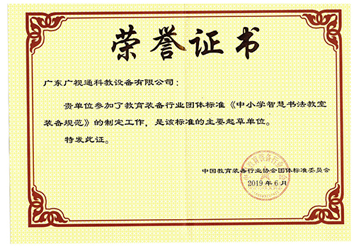 近日,中國教育裝備行業(yè)協(xié)會團體標(biāo)準(zhǔn)委員會頒發(fā)了《中小學(xué)智慧書法教室裝備規(guī)范》起草制訂單位證書,廣東廣視通科教設(shè)備有限公司參加了本規(guī)范標(biāo)準(zhǔn)的制定工作,是該標(biāo)準(zhǔn)的主要起草單位。