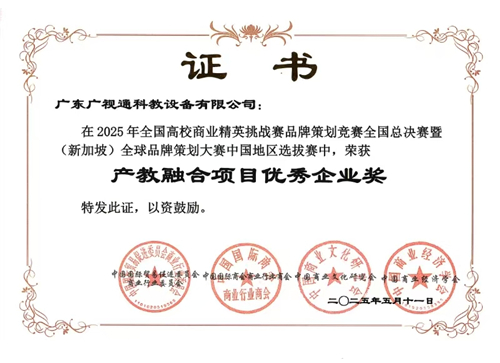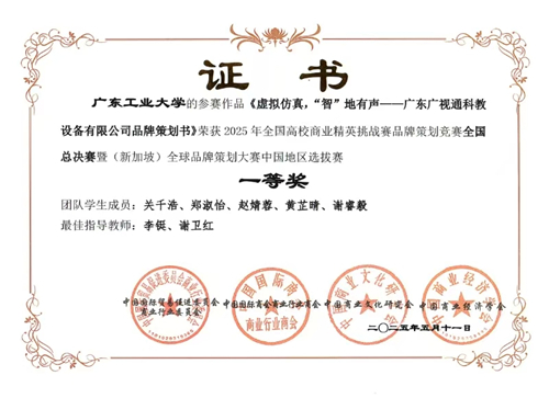 2025年全國高校商業精英挑戰賽品牌策劃競賽全國總決賽暨(新加坡)全球品牌策劃大賽圓滿收官。廣東廣視通科教設備有限公司與廣東工業大學參賽團隊合作的《虛擬仿真,“智”地有聲——廣東廣視通科教設備有限公司品牌策劃書》斬獲全國總決賽一等獎,且斬獲2025年(新加坡)全球品牌策劃大賽銀質獎。廣視通在本次大賽中榮獲產教融合項目優秀企業獎。