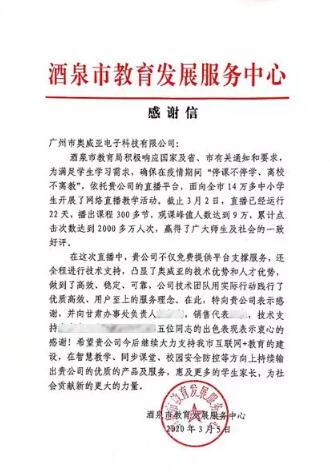 圖為酒泉市教育發(fā)展服務(wù)中心給予奧威亞的感謝信