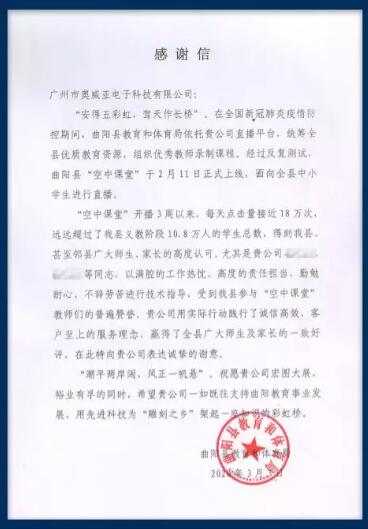 圖為曲陽縣教育和體育局給予奧威亞的感謝信