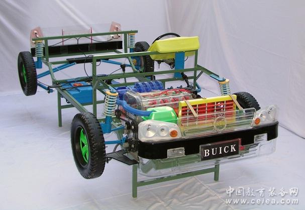 本品選用透明有機玻璃制作,內中部件均以硬質塑料加工,利用螺絲固定在金屬高溫烘漆而成的車架上。各總成都以壓模成形加工,代替過去用膠水粘合的辦法,使本品在牢固度上有很大的提高。發動機總成,以電力驅動,油門設有調速裝置,能演示發動機轉速的高低。離合器分離明顯,操縱靈活,離合器外殼整體壓模而成,變速器的各檔齒輪用各種顏色表示,操縱自如,其中主減速、差速,轉動靈活,車輪對開壓鑄,刻有防滑槽紋,看上去美觀大方。轉向裝置以及電瓶、油箱、水箱,做工精細,富有光澤。制動管路分布清楚,一目了然。電路采用對插件前后分布,前燈架和風扇用透明有機玻璃壓模成整體,看上去美觀逼真,儀表板及后燈架逼真堅固。