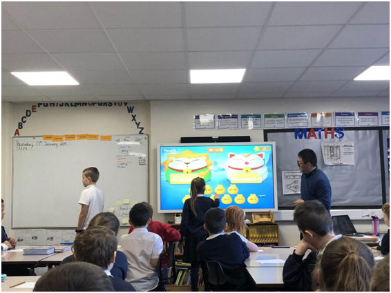 我深知一堂好的數(shù)學(xué)課首先要能激發(fā)學(xué)生的興趣,讓他們能被老師吸引,英語(yǔ)不好的我只能靠技術(shù)來(lái)彌補(bǔ)。于是我向英國(guó)老師秀出我們信息技術(shù)對(duì)教學(xué)的幫助。