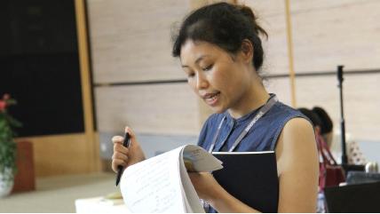有的老師捧著自己的筆記,邊來回踱步,邊一字一句地輕聲練習。