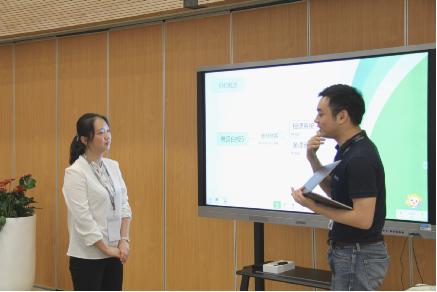 有的老師站在大屏前,不斷地模擬考核的場景,并且讓其他老師幫忙指出自己的不足——“我剛剛講的有哪里不對嗎?沒事兒,你盡管說,我想表現的更好一些�!薄罢w表現都很好,不過你可以試著更加親切一些,你看像這樣會不會更好……”