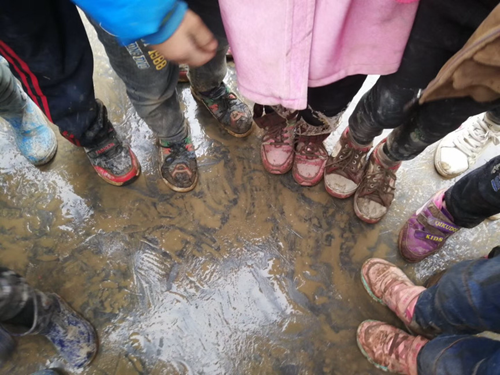 好多孩子穿的要么是笨重寬大不透氣的雨鞋,要么是滿是泥水、濕透了的帆布鞋或球鞋,這一濕就是一整天。有幾個男孩腳上穿著姐姐留下的粉紅鞋,卻很滿足地說很喜歡。問孩子們冷嗎?他們靦腆地笑著搖頭,卻告訴我們他很喜歡學校,這兒比家里吃得好,玩得開心�?粗@樣一群質樸的孩子,心里一陣酸楚。