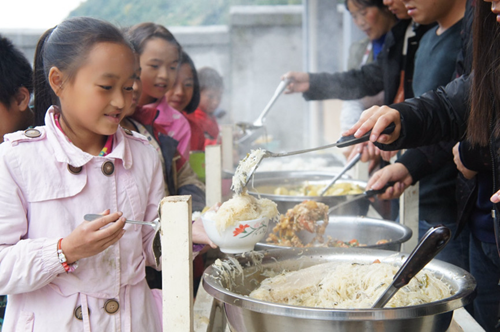 二是孩子們的營養午餐。學校給孩子們提供一頓營養午餐,兩素一葷一湯。到午飯時間,校園里一下熱鬧了起來,只見孩子們拿著餐具笑說著歡快地來到食堂門前,又規規矩矩地排隊打飯。10月中旬的果珠鄉陰冷、潮濕,但飯菜熱氣騰騰。孩子們臉上洋溢著企盼,打好飯菜后一個個心滿意足。