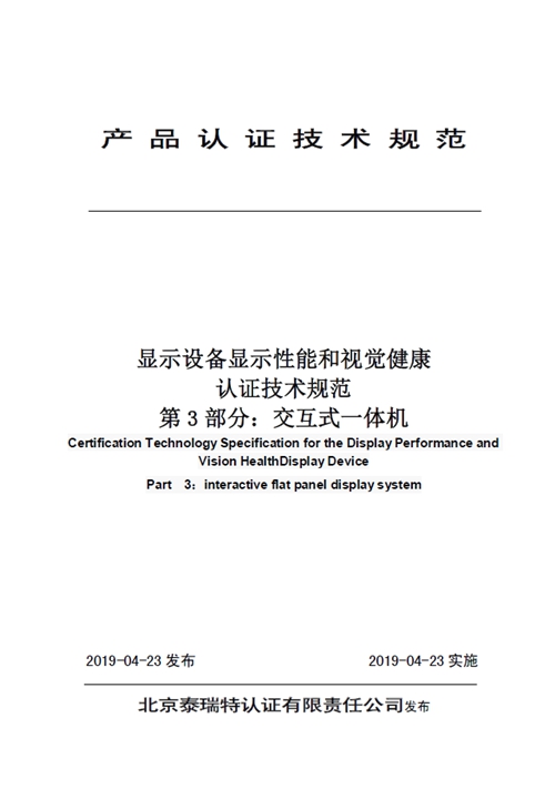 為從質量管理角度解決這一問題,北京泰瑞特認證有限公司、國家廣播電視產品質量監督檢驗中心與廣州視睿電子電子科技有限公司聯合制定了《顯示設備顯示性能與視覺健康認證技術規范