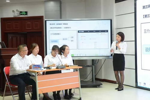 汽開區(qū)第十三小學(xué)語文團隊現(xiàn)場展示了基于信息技術(shù)支撐下的校本研修。研修采用了翻轉(zhuǎn)式、線上線下相融合的方式,圍繞如何引領(lǐng)孩子說得精彩的核心問題,破解了教育教學(xué)中的實際問題,同步提升了教師的學(xué)科專業(yè)素養(yǎng)和信息技術(shù)應(yīng)用能力,提供了一個信息技術(shù)應(yīng)用能力提升工程與校本研修相融合的現(xiàn)場案例。其中教師匯報討論應(yīng)用的軟件為希沃白板5,利用了思維導(dǎo)圖以及板中板等功能實現(xiàn)歸納總結(jié),并應(yīng)用了希沃授課助手進(jìn)行同屏互傳,遠(yuǎn)程操控。