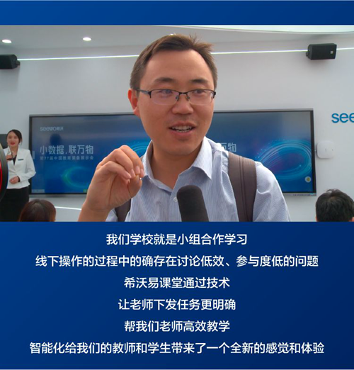 一位老師在體驗了希沃易課堂小組合作學習任務后講道:“我們學校就是小組合作學習,線下操作的過程中的確存在討論低效、參與度低的問題。這次來展會,就想體驗下小組合作學習。希沃易課堂通過技術,讓老師下發任務更明確,幫我們老師高效教學,智能化給我們的教師和學生帶來了一個全新的感覺和體驗。”