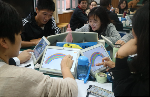 隨后,她在場的教師們下發(fā)了小組協作任務,以畫彩虹的方式體驗希沃易課堂功能。畫作展示過程中笑聲不斷,她在最后總結到:“假如學生也能在這種輕松的氛圍中共同完成小組協作任務,不僅效率高,還能鍛煉學生的合作意識。”