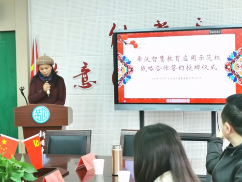 在簽約儀式上,新明中心小學吳紅花主任表達了對教研員黃吉雁老師的感謝,希望以此次的授牌儀式為起點,擴大校企合作領域,加強合作探究力度,加強對教師教學應用智慧課堂管理的培訓提升,并通過信息化技術開發,教研教學交流,以智慧課堂打造等方式共同促進教與學的協同發展,共創合作共贏的新局面。