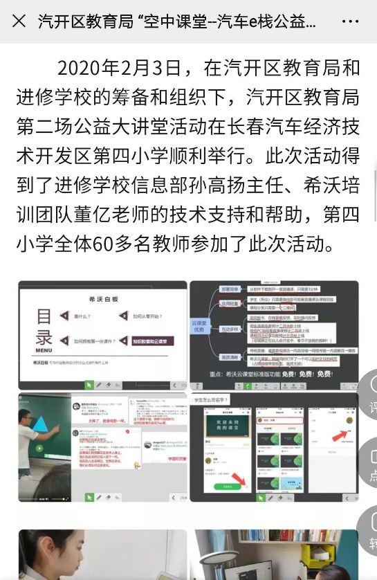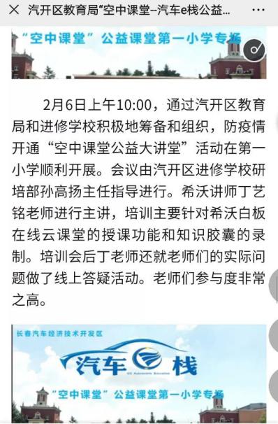 在疫情突襲的停課期間,汽開區內的小學依托“希沃白板5”軟件或云課堂功能,實現了掃碼即入、畫面高清、語音清楚、在線互動高效的設計預期,構建了師生面對面、指導零距離、離校不離教、下課不下線的網絡互動學習環境。同時,汽開區“汽車e�!眻F隊面向長春車城子弟,率先開啟利用希沃云課堂進行“空中課堂”公益活動。