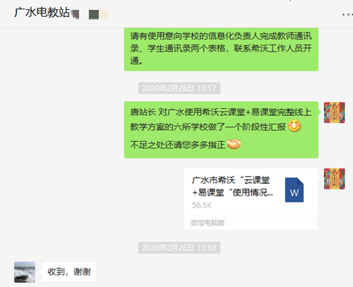 2月3日,希沃易課堂+云課堂的線上全流程教學(xué)方案已初步形成,唐館長(zhǎng)召開(kāi)了廣水市疫情期間網(wǎng)絡(luò)教學(xué)工作部署線上會(huì)議。會(huì)議要求各學(xué)校根據(jù)實(shí)際情況,做好網(wǎng)絡(luò)教學(xué)培訓(xùn)等各項(xiàng)準(zhǔn)備工作。
