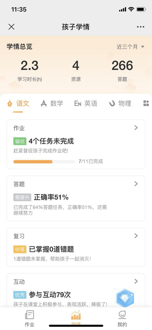 廣水市長(zhǎng)嶺鎮(zhèn)中心小學(xué)學(xué)生家長(zhǎng):“關(guān)注易課堂家長(zhǎng)公眾號(hào)就可以收到老師布置的作業(yè)提醒,非常的方便。孩子做完后還能查看具體的學(xué)習(xí)情況,對(duì)做的不好的地方可以重點(diǎn)輔導(dǎo),省去了很多和老師溝通的時(shí)間。”