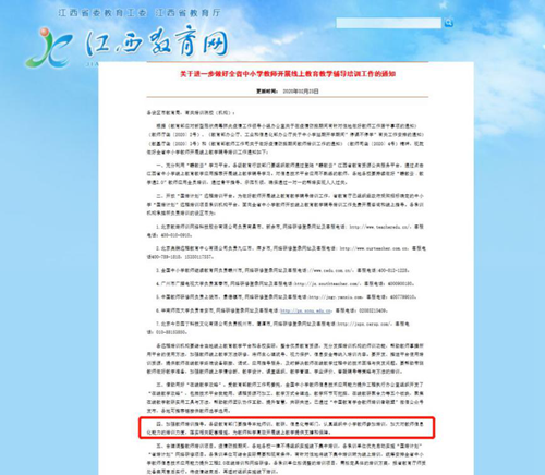 2020年2月25日,江西省教育廳發(fā)布了《關(guān)于進(jìn)一步做好全省中小學(xué)教師開展線上教育教學(xué)輔導(dǎo)培訓(xùn)工作的通知》。通知中特別指出:“加強(qiáng)教師培訓(xùn)指導(dǎo):各級(jí)教育部門要指導(dǎo)本地師訓(xùn)、教研、信息化等部門,認(rèn)真組織中小學(xué)教師參加培訓(xùn),加大對(duì)教師信息化能力的培訓(xùn)力度,落實(shí)相關(guān)配套措施,為教師科學(xué)高效開展線上教學(xué)提供支撐和保障。”