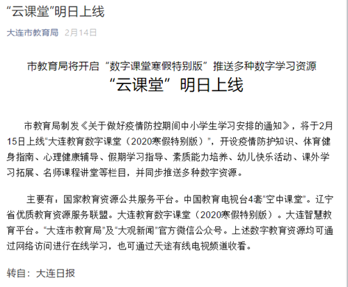 自疫情爆發(fā)以來,大連市教育局組織全市數(shù)百位教學(xué)名師精心制作,結(jié)合學(xué)生假期學(xué)習(xí)生活特點,推出了“大連教育數(shù)字課堂(2020寒假特別版)”,開設(shè)疫情防護(hù)知識、假期學(xué)習(xí)指導(dǎo)、名師課程講堂等欄目,并同步推送多種數(shù)字資源。