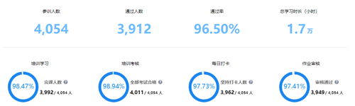 此次培訓獲得都安瑤族自治縣教育局高度重視以及全縣老師的積極響應,據悉,初階培訓參加人數共計4,054名。截止至2020年5月21日,初階培訓取得圓滿的成功,全縣教師累計學習時長共計1.7萬小時,培訓考核通過人數為3912人,考核成功率96.5%,此次培訓達到預定目標,基本實現老師能夠通過培訓掌握交互式課件制作的要求。