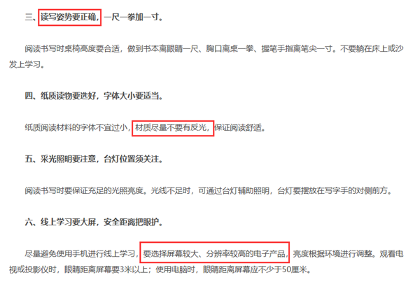 眾所周知,中小學(xué)階段正處于視力發(fā)育的關(guān)鍵時(shí)期,呵護(hù)用眼健康,不僅要保持正確的讀寫姿勢(shì),還要主動(dòng)選擇有益于眼健康的環(huán)境。對(duì)此,《要訣》中明確提出了“讀寫姿勢(shì)正確”、“閱讀材質(zhì)不反光”、“選擇屏幕較大、分辨率較高的電子產(chǎn)品”等需求。