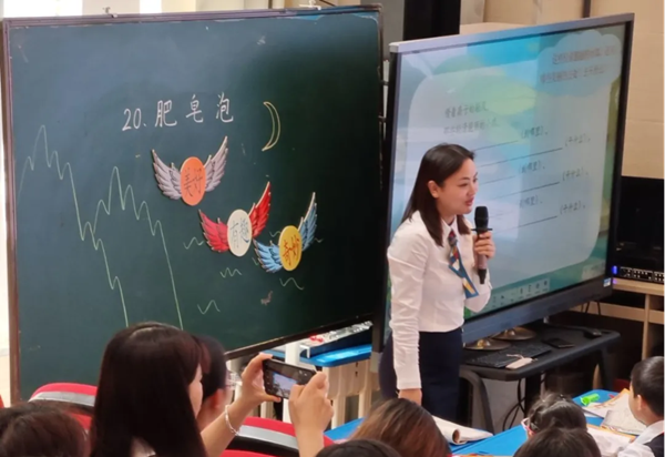 現場所有參賽老師都使用了希沃的信息化教學軟件——希沃白板及班級優化大師輔助課堂教學。瀘州市梓橦路小學校桂秋瓊老師喜獲特等獎,桂老師執教的是部編版小學語文三年級下冊的《肥皂泡》一課,通過抓關鍵詞理解難懂的句子。本堂課信息化教學應用巧妙,借助希沃中的課堂活動激發學生學習的興趣,自制教學視頻實現課堂與生活的有效連接,同步課堂實現了兩校師生同時在線學習。全市小學教師代表大約共計600人次聽課觀摩。