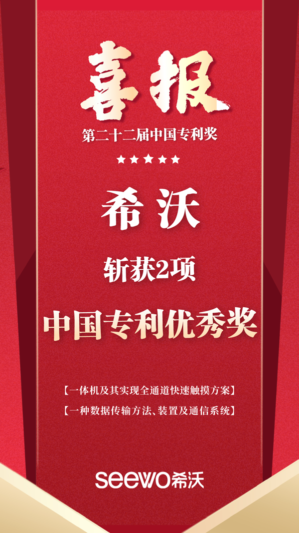 第二十二屆中國專利獎獲獎名單公布,希沃“一體機及其實現全通道快速觸摸方案”和“一種數據傳輸方法、裝置及通信系統”兩項技術雙雙斬獲中國專利優秀獎。