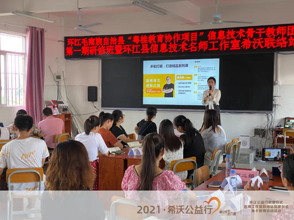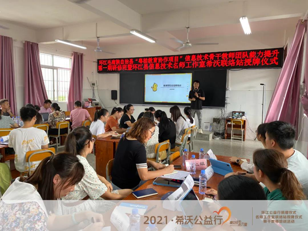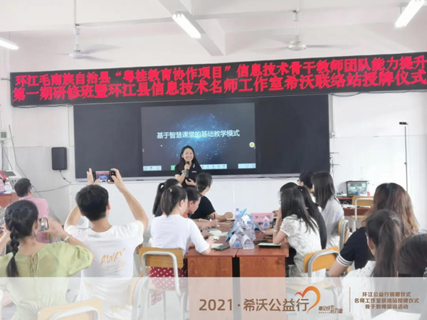 2021年8月19日,希沃在環江毛南族自治縣第三小學舉行了希沃公益行設備捐贈儀式。同時,希沃攜手環江毛南族自治縣教育局,共同助力環江縣名師工作室骨干教師成員開展了為期兩天的“粵桂教育協作項目”研修班活動,讓骨干教師團隊就創造更多樣化教學模式展開了深度的研修和探討。環江毛南族自治縣教育局莫李全委員、電教站黃廣正站長、譚炤宇副站長、師培中心覃品優老師、林文強老師、環江三小校長羅懿校長、希沃廣西區域總經理郭寧等領導受邀出席了本次活動,并與教師們共同見證了環江毛南族自治縣信息技術名師工作室希沃聯絡站授牌儀式。