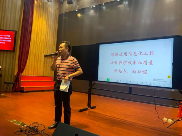 天涯區(qū)教育局教研室主任楊得伸上臺發(fā)表講話:“當(dāng)前,教育信息化已經(jīng)步入加快推進的黃金時期,也進入升級發(fā)展的關(guān)鍵期。我區(qū)堅持‘以信息技術(shù)與教育教學(xué)深度融合推動教育理念變革、模式再造、體系重構(gòu)、機制創(chuàng)新’核心理念,聚焦‘智慧教育示范區(qū)’建設(shè)目標(biāo),聚力實施‘天涯區(qū)智慧教育建設(shè)行動’。在剛結(jié)束的線上學(xué)習(xí)中,我區(qū)共計886人通過培訓(xùn),整體培訓(xùn)通過率達(dá)到87%,其中16人被評為優(yōu)秀學(xué)員;在此我對以上老師表示衷心的祝賀。今天我們邀請到海口北師大、華二黃流中學(xué)、北京外國語附屬的三名教師給我做公開課分享交流活動。希望老師們有所成長、有所收獲。最后,要再次感謝希沃在本次活動中的大力支持。”