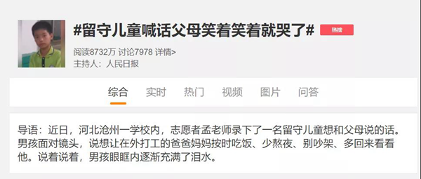 近日,#留守兒童喊話父母笑著笑著就哭了#的微博話題引發網友熱議,留守兒童的懂事,讓人直呼心疼破防。