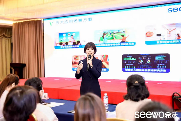 信息化時代,推動科技與教育的融合是大勢所趨。迎合時代趨勢,契合科學(xué)幼小銜接的理念,希沃在活動現(xiàn)場帶來了智慧幼兒園整體解決方案,致力于推動幼兒教育的轉(zhuǎn)型升級。希沃海口辦客戶顧問梁映雪在現(xiàn)場為與會者們講解了方案的研發(fā)初衷與諸多功能性亮點(diǎn)。