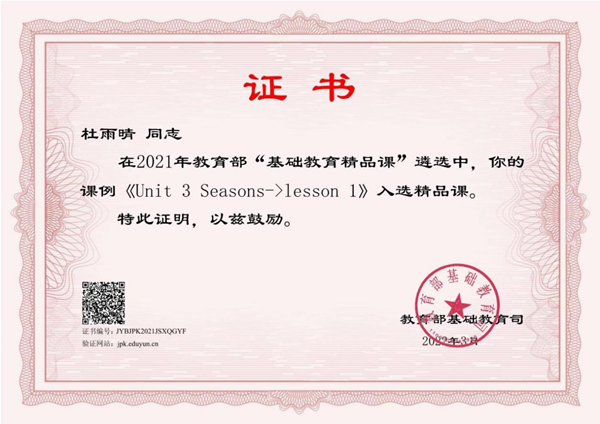 培訓(xùn)活動結(jié)束后,濮陽市實(shí)驗(yàn)小學(xué)揭曉了2021年度教育部基礎(chǔ)教育精品課評選,學(xué)校青年教師杜雨晴以其扎實(shí)的信息素養(yǎng)和良好的教學(xué)能力,作為濮陽市直學(xué)校唯一代表入圍了國家級評選并榮獲教育部精品課。