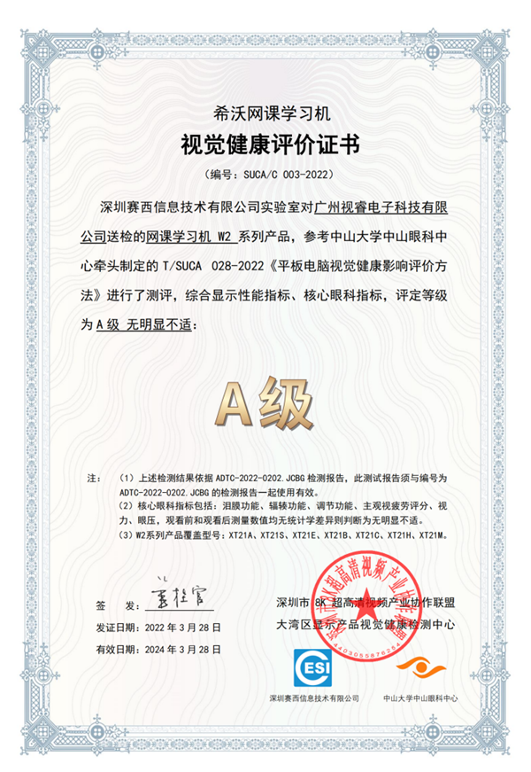 028-2022《平板電腦視覺健康影響評價方法》,經過深圳賽西信息技術有限公司實驗室測評,獲得視覺健康影響A級評定,標志希沃網課學習機W2在觀看舒適度上達到了“高標準”的視覺體驗。