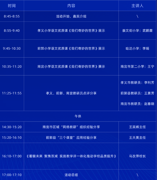 17日下午,活動還邀請到了南宮市教研室王英輝主任、前郭縣教師進修學校王天昊主任以及孝義市振興東街郭世玲校長做了三個課堂應用經驗和新課改教學經驗主題報告。