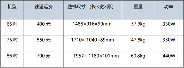 ☞交互智能平板設備單臺往返運費及設備規格(加壁掛厚度增加30mm)如下: