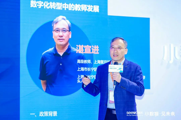 在交流會上,湛校長結(jié)合國家政策,介紹了上海市和長寧區(qū)的教育數(shù)字化轉(zhuǎn)型方案,并闡述了上海市復(fù)旦初級中學的教師發(fā)展理念。