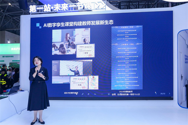 圍繞“教、學(xué)、研、訓(xùn)”四個場景,林曉宇副校長分享了AI數(shù)字孿生課堂在博雅小學(xué)校教師發(fā)展數(shù)字化轉(zhuǎn)型中的應(yīng)用。