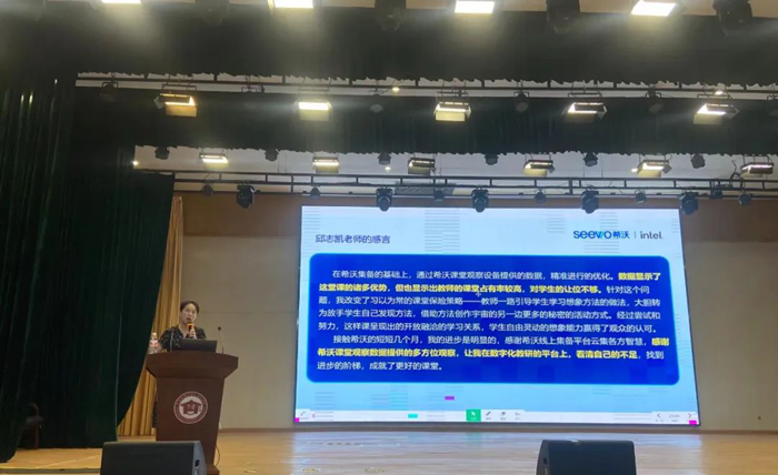 期間,希沃山東區域服務運營顧問戴思作《希沃+AI、探索新技術在中小學教學教研中的實際應用》主題分享。她提到,當前,希沃課堂智能反饋系統提供的精準數據和客觀評判標準,能夠幫助老師們對比每節課的數據變化,去實現磨課閉環。教師發展中心湖南區域教師顧問程晨以“AI技術支持下的數字化共生教研新樣態”為題進行分享,為參訓教師開展循證教研提供新思路。