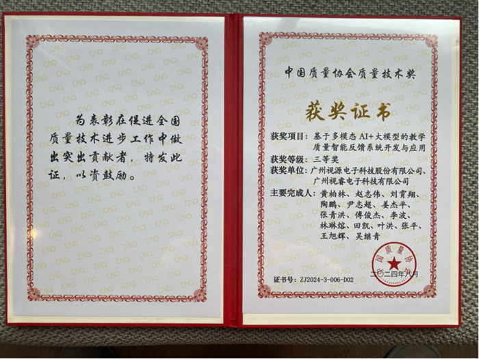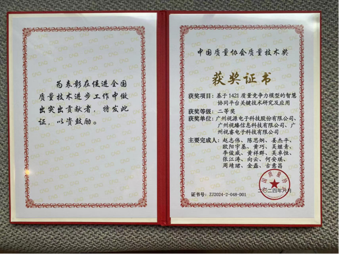 近日,2024年度全國質量技術獎揭曉,視源股份申報的技術成果《基于1421質量競爭力模型的智慧協同平臺關鍵技術研究及應用》榮獲二等獎,另一技術成果《基于多模態AI+大模型的教學質量智能反饋系統開發與應用》則榮獲三等獎。中國質量協會質量技術獎是2005年經國家科技部、國家科技獎勵辦公室批準設立的科學技術獎項,以表彰在質量技術領域中做出突出貢獻的單位或個人,是我國質量技術領域的最高榮譽。