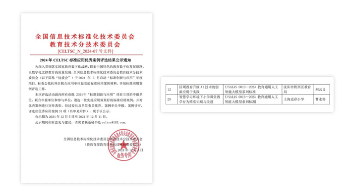 近日,全國信息技術標準化技術委員會教育技術分技術委員會暨教育部教育信息化技術標準委員會(以下簡稱“標委會”)于海南省三亞市召開了“2024下半年全體會議暨教育信息化技術標準研討會”,公布了2024年CELTSC標準應用優秀案例評選結果。由廣州視睿電子科技有限公司(希沃)技術支持的兩個案例入選,分別是沈陽市鐵西區教育局的《區域教育升級AI技術的創新應用于實踐》、上海市長寧區適存小學的《智慧學習環境下小學課堂教學行為精準識別與改進》。