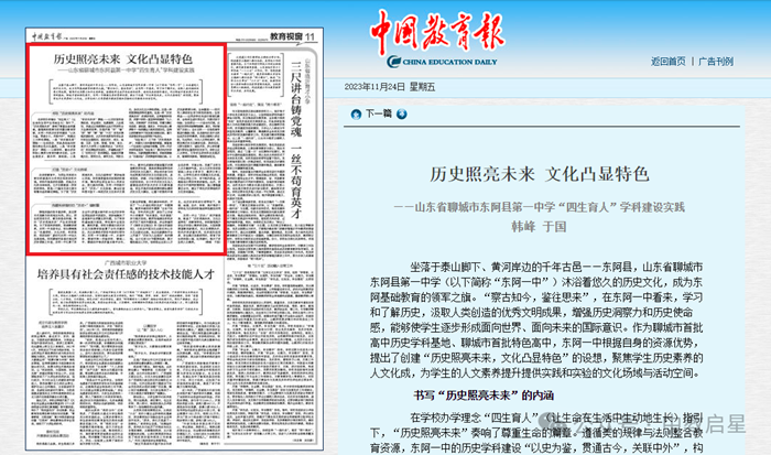 2023年7月26日,韓峰老師率領東阿一中教師團隊參加全國首屆新課標下的課堂改革研討會暨課堂重構主題研修班,四位教師先后作課例分享。8月25日,韓峰老師在全省歷史骨干教師培訓班作《四生課堂,思維飛揚》為題的講座,分享了學校在“三新”背景下的課堂探索與改革實踐。2023年11月24日《中國教育報》以《歷史照亮未來,文化凸顯特色》為題介紹東阿一中的歷史學科基地和特色高中建設的經驗和做法。