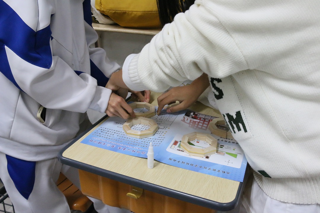 課程的后半段是同學們最喜歡的手工環節。譚老師將參加課程的同學們分為兩人一組,每組一起協作,利用中教啟星提供的材料包制作出一口轆轤井。
