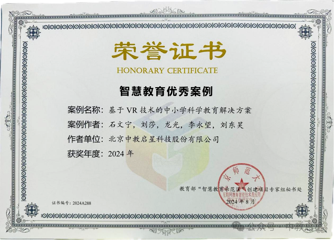 會議期間,主辦方隆重發布了教育部智慧教育示范區“2024年度智慧教育優秀案例”名單。在眾多參評項目中,中教啟星憑借創新性的《基于VR技術的中小學科學教育解決方案》脫穎而出,成功獲評為“智慧教育優秀案例”。這一榮譽不僅肯定了中教啟星在智慧教育領域的積極探索和卓越成就,也展示了中教啟星在推動教育技術融合與創新方面的領先地位。