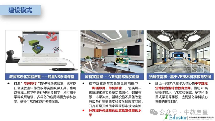 依托中教啟星十幾年教育資源開發的能力與技術成果,參照學科教室功能室的項目建設經驗,中教啟星VR+科學教育解決方案面向三大應用場景,打造三大模式全方位助力學校開齊開足開好國家課程標準規定科學實驗課程。