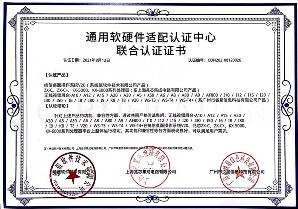 兆芯認證證書(無線視頻展臺、視頻采集互動終端)