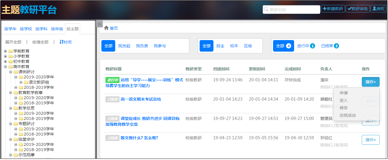 支持“自主教研、校本教研、區域教研”三種級別的教研活動,鼓勵教師充分利用該平臺來開展自主教研活動;