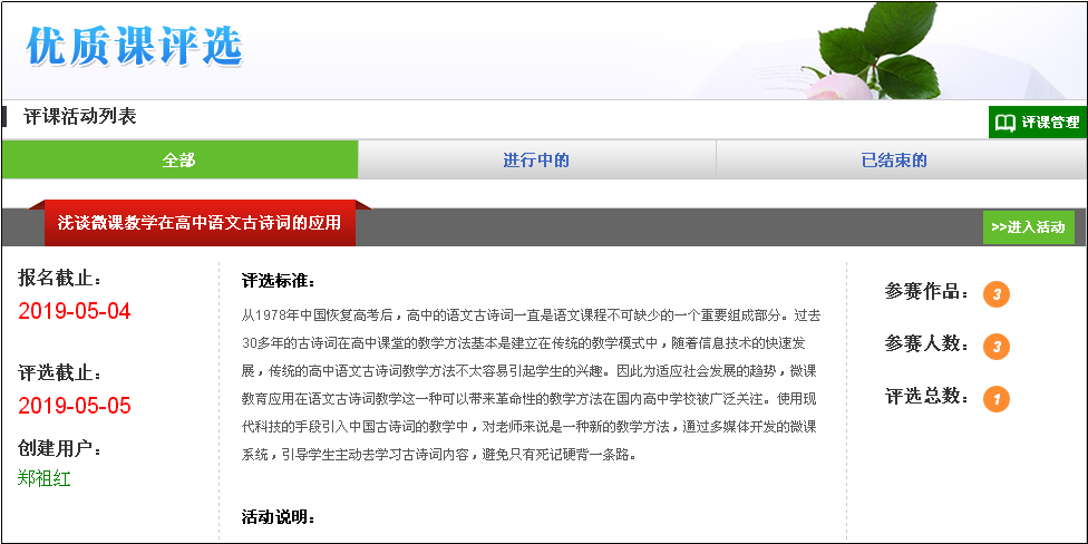 在評課系統首頁,選擇正在報名中的活動,進入活動之后點擊“報名參賽”按鈕;報名成功后,務必在規定的時間段內提供參賽作品;參賽作品可以是一門網絡課程,也可以是一個教學資源,也可以是一個專題資源。