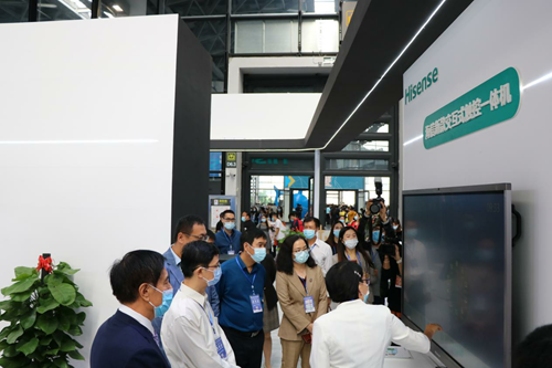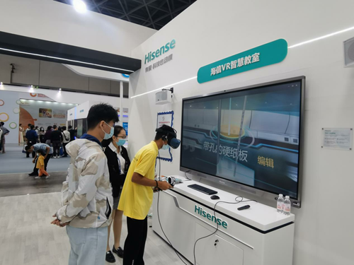 在展會(huì)現(xiàn)場(chǎng),海信交互式觸控一體機(jī)+VR打造虛擬仿真實(shí)驗(yàn)平臺(tái)、海信智慧課堂解決方案、海信智慧物聯(lián)教室、校園集控管理、多媒體信息發(fā)布平臺(tái)等吸引人眾人圍觀。
