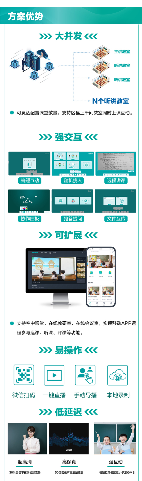 基于“三個課堂”教育政策基礎下海信“三個課堂+”系統解決方案。全新的海信“三個課堂+”系統解決方案打破傳統“1托3”限制,建立多間“1托N”教學子系統,區域間可實現千間教室同時在線互動學習。該方案不僅可滿足專遞課堂,名師課堂、名校網絡課堂的“三個課堂”的場景應用,同時也可滿足遠程會議、空中課堂、在線教研、“四點半工程”、巡課督導等應用需求。最新版本還創新性的提供了“遠程講評”“答題互動”等功能,搭配協作白板、隨機挑班、搶答等互動工具,打造趣味性課堂互動模式,讓主講老師充分關注到聽講班級的每位學生,即使相隔千里,猶如置身同一課堂。