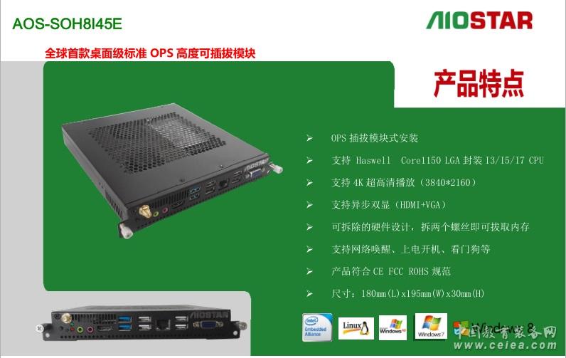 Aiostar OPS 全稱為:Aiostar Open Pluggable Specification,開放式可插拔規(guī)范。是Intel與顯示器廠商共同制定的標(biāo)準(zhǔn)化數(shù)字標(biāo)牌接口規(guī)范。OPS內(nèi)部組成是一個X86架構(gòu)的迷你PC,采用英特爾酷睿處理器,配有內(nèi)存、硬盤、多種輸入輸出接口以及Windows操作界面,尺寸為200mm x 119mm x 30mm 。 以下為Intel 官網(wǎng)對于OPS的定義: 原文如下: Digital Signage Open Pluggable Specification :Simplify digital signage development Highlights Enables easier installation, use and maintenance of digital signs. Makes digital signage devices more intelligent and connected. Overview The open pluggable specification (OPS) helps standardize the design and development of digital signage devices and pluggable media players. Intel created OPS to address digital signage market fragmentation and simplify device installation, usage, maintenance and upgrades. OPS enables digital signage manufacturers to deploy interchangeable systems faster and in higher volumes, while lowering costs for development and implementation. Installing digital signage equipment based on Intel architecture helps you implement scalable digital signage applications that can network easily with other equipment. This simplifies interoperability and application upgrades designed to meet the digital signage requirements of individual customers, while helping to future-proof technology investments.[1] 譯文: 強調(diào) 更便于安裝、使用和維護的數(shù)字信號。 使數(shù)字看板設(shè)備更智能和融合。 概述 開放的可插拔的規(guī)范(OPS)有助于規(guī)范的設(shè)計和開發(fā)數(shù)字看板設(shè)備,并插入媒體播放器終端。Intel創(chuàng)造OPS 致力于數(shù)字看板市場分化和簡化設(shè)備安裝、使用、維護和升級。 OPS可以使數(shù)字看板制造商更快部署大量的交互系統(tǒng),同時降低開發(fā)和實現(xiàn)的成本。 安裝基于英特爾架構(gòu)的數(shù)字標(biāo)牌設(shè)備可以幫助您實現(xiàn)可伸縮的數(shù)字看板應(yīng)用程序,并且很容易和其他設(shè)備進行網(wǎng)絡(luò)連接。這簡化了通過交互和升級的設(shè)計來滿足個人客戶的數(shù)字看板需求,同時有利于面向未來的技術(shù)投資。 2特點編輯 1、支持?jǐn)?shù)字標(biāo)牌等行業(yè)最新的OPS規(guī)范的電腦模塊,加速數(shù)字標(biāo)牌行業(yè)的標(biāo)準(zhǔn)化趨勢。 2、OPS模塊可以簡化設(shè)備的安裝、使用、維護和更新,幫助數(shù)字標(biāo)牌制造商降低開發(fā)和實施成本。 3、OPS可簡便地與其它設(shè)備聯(lián)網(wǎng),可擴展數(shù)字標(biāo)牌應(yīng)用,滿足數(shù)字標(biāo)牌對交互和應(yīng)用更新的需求。 4、部分OPS平臺支持遠程管理及低功耗模式,解決耗電及散熱要求。同時平臺所支持的Intel vPro、AMT遠程管理技術(shù),實現(xiàn)設(shè)備無人操控下的高效運作。如采用四代i5+Q87平臺的AOS-SOQ8I45A 5、OPS無風(fēng)扇散熱設(shè)計,提供超靜音的解決方案,保證工作環(huán)境的安靜、清爽。發(fā)熱量小也帶來了較小的功耗。 3整機編輯 Intel 2011年提出該規(guī)范后,伴隨著日本NEC OPS接口顯示器的上市,傳統(tǒng)數(shù)字標(biāo)牌嵌入式主板走下神壇,OPS模塊化正式開啟。代表作品有 愛鑫微電子(AIOSTAR) AOS-SOH8I45A ,