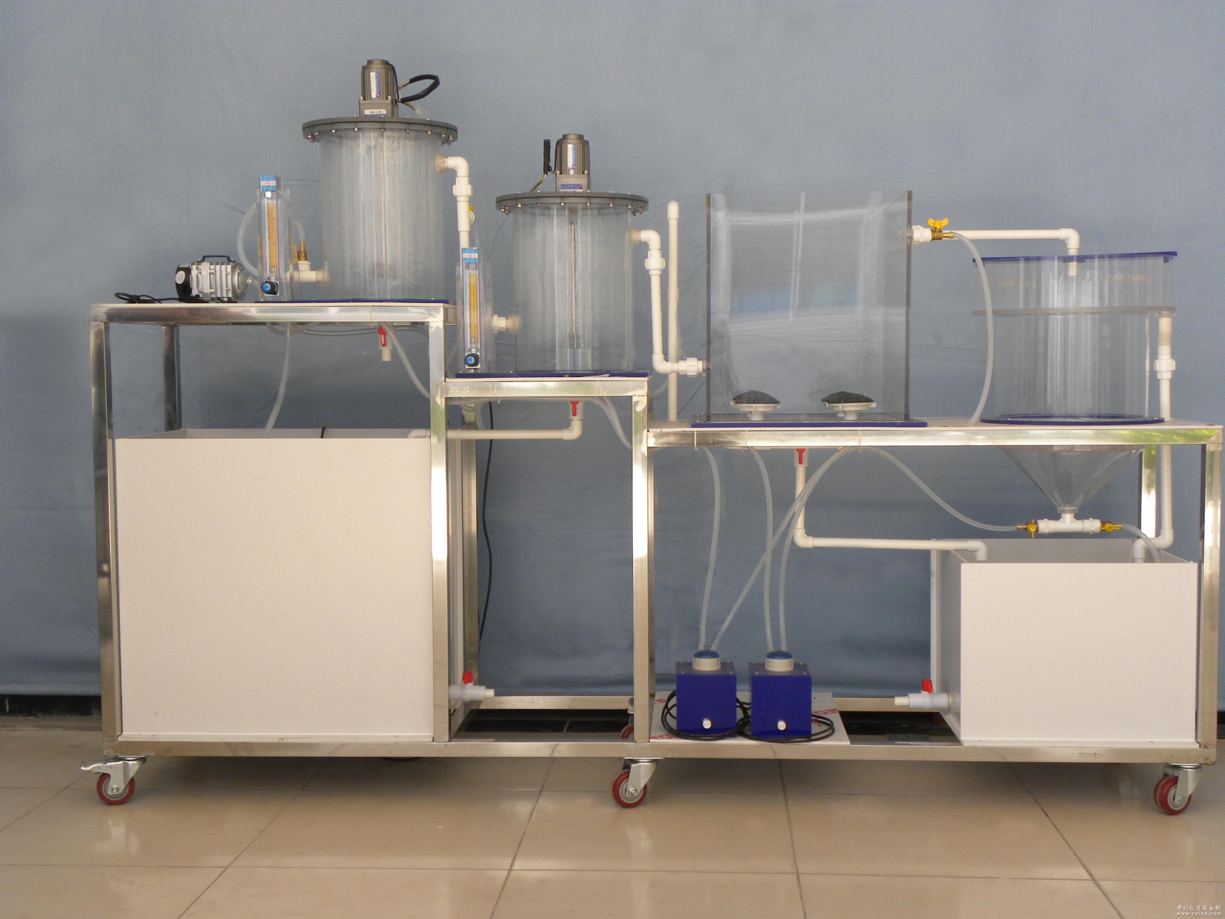 設備配置:反應池采用透明有機玻璃、底板采用藍色有機玻璃材質:厭氧池、缺氧池、好氧池、沉淀池、原水箱(PP材質)、清水箱(PP材質)。小型進水泵1臺、進水流量計1個、靜音充氧泵1臺、氣體流量計1個、調速電機2臺、可控硅調速裝置2套、廢水攪拌器2套、污泥回流泵1臺、混合液回流泵1臺、自動控制箱(鋅合金彈跳鎖)1套、可編程序控制系統1套、漏電保護開關1套、電源電壓表1個、按鈕開關、連接管路、閥門等1套、帶移動輪不銹鋼實驗臺架1套。