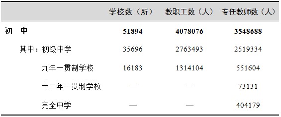 全國共有初中學校5.19萬所(含職業初中15所),比上年減少224所,下降0.43%。招生1547.22萬人,比上年增加60.05萬人,增長4.04%;在校生4442.06萬人,比上年增加112.69萬人,增長2.60%;畢業生1397.47萬人,比上年減少26.40萬人,下降1.85%。初中階段毛入學率103.5%。