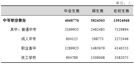 中等職業教育畢業生496.88萬人,比上年減少36.75萬人,下降6.89%。其中,普通中專畢業生216.99萬人,比上年減少12.03萬人;職業高中畢業生128.99萬人,比上年減少12.88萬人;技工學校畢業生90.48萬人,比上年減少2.59萬人;成人中專畢業生60.41萬人,比上年減少9.25萬人。